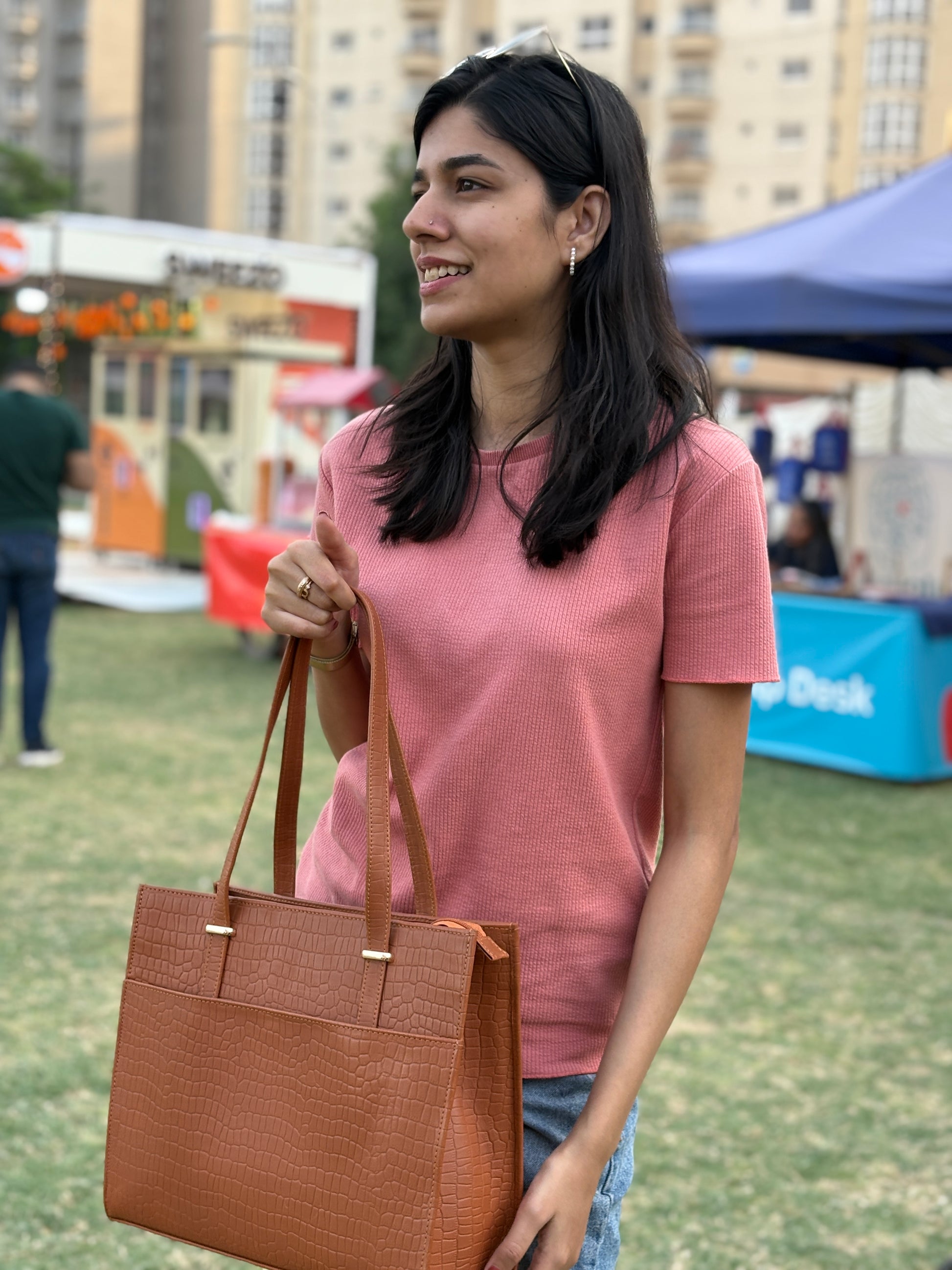 This medium-sized tote is made in classy crocodile-textured leather and is built to handle real life. It has multiple sections inside to keep things in place (finally) and a front outer pocket for easy-grab essentials.